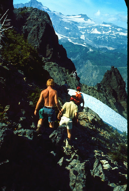 I, Greg, and six others hiked to Unicorn Peak to practice rock climbing. Sharon had a serious accident on this trek. We were on the way back from improving our belay skills and encountered the steep slope of snow that we had climbed up on the way to Unicorn. Sharon started down the slope first and when she when into self arrest her ice ax popped out of her hands. She had planted it into ice. She lost control and slid to the shale rocks below hitting hard and bouncing. I was stunned. I slid down to her and Greg was right behind me. We administered first aid and painfully she walked out. That was a near disaster.